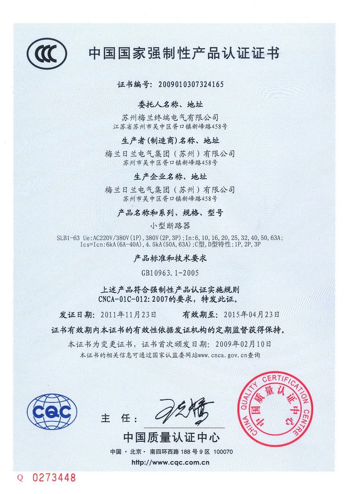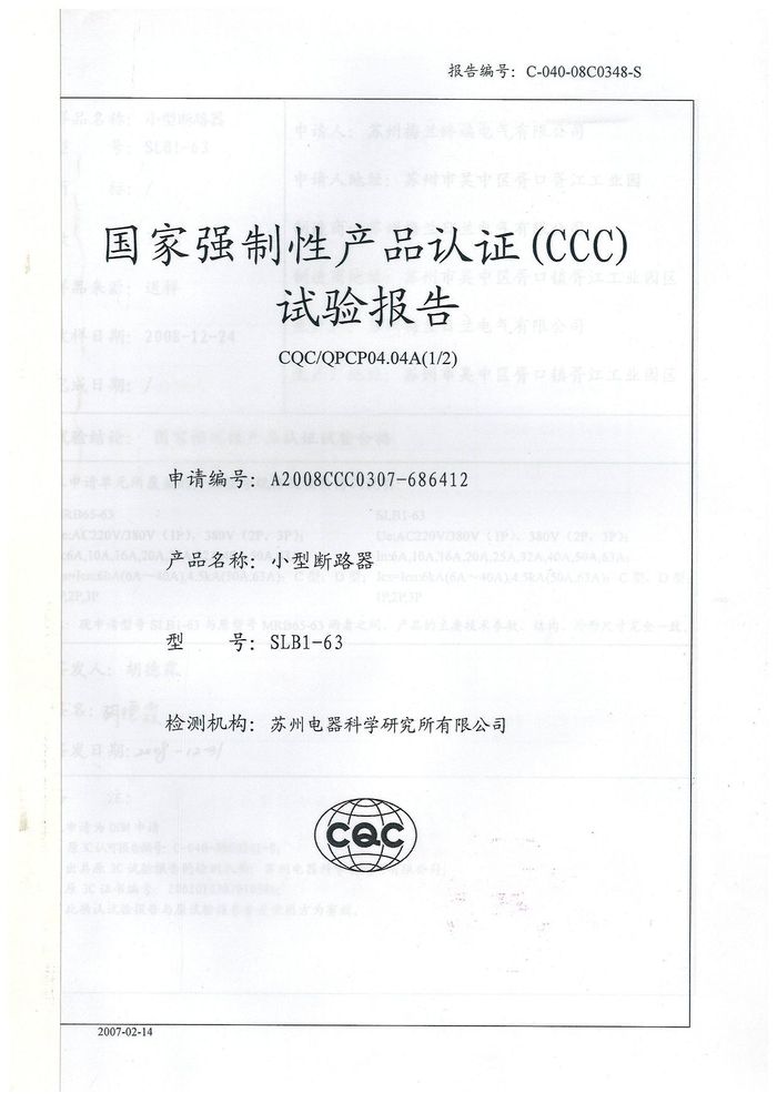 SLB1-63小型斷路器資質(zhì)證書