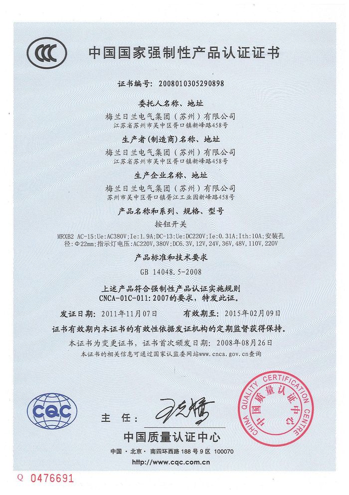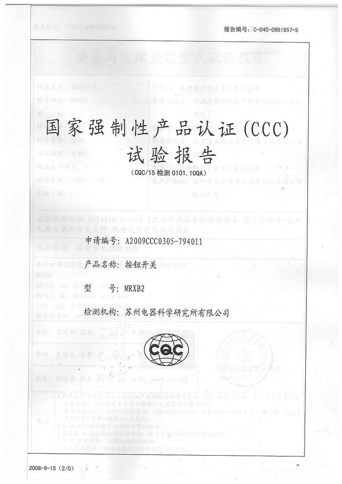 MRXB2按鈕開關資質證書