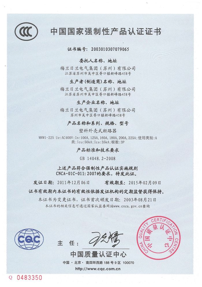 MRM1-225塑殼斷路器資質(zhì)證書(shū)