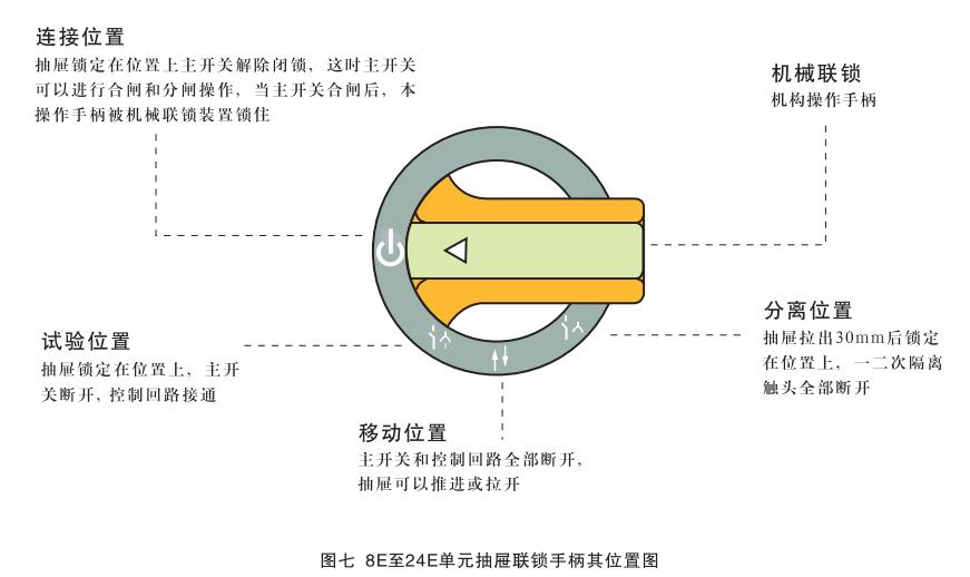 8E/4, 8E/2單元抽屜的操作:這種操作是通過對抽屜面板上的手柄進(jìn)行操作實(shí)現(xiàn)的,見圖六。只有當(dāng)手柄上的白箭頭指示“移動(dòng)位置”(↑↓)時(shí),抽屜方可抽出或插入,在其它任何位置上,抽屜都應(yīng)被鎖定,因此不可能對抽屜實(shí)施抽出或插入操作。此時(shí)不可硬拉或硬拖以免損壞機(jī)械聯(lián)鎖機(jī)構(gòu),抽屜從連接位置抽出30mm(此時(shí)手中工件一輕微震頗感)時(shí)將操作手柄向逆時(shí)針方向轉(zhuǎn)過45°,抽屜即被鎖定在“分離位置”(↑↓)此時(shí)一次和二次隔離插件均己脫離電網(wǎng)并形成安全間隔。